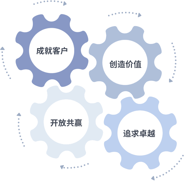 成就客户是一切决策的出发点,,,,创造价值是衡量所有工作的标准,,,,追求卓越是我们做事做人的态度,,,,开放共赢是我们的格局也是最终的结果。。。。价值观的齿轮环环相扣,,,推动着组织里的每个人不断向前。。。。
