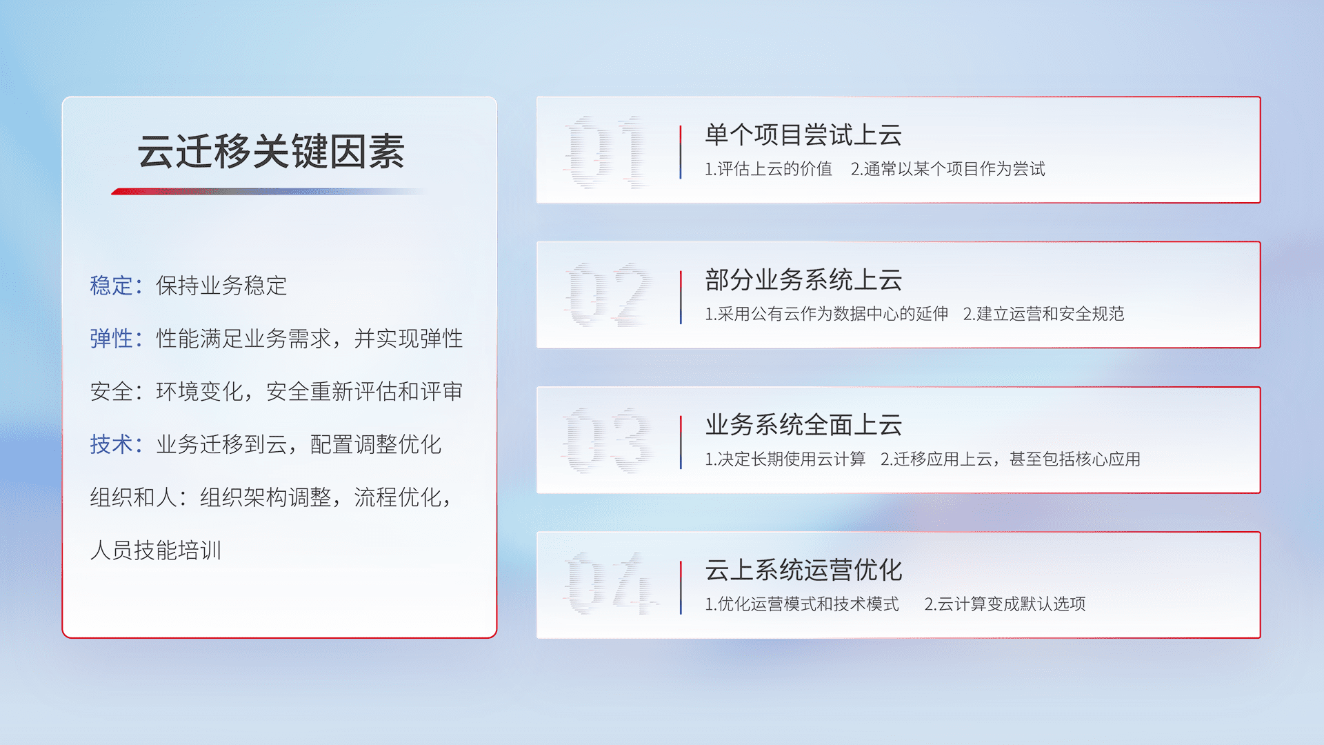 结合实际业务,,从规划设计、、、、云平台选型、、云原生改造、、、、数据迁移、、集成交付,,,迁移全过程为客户识别最佳上云路径,,做好风险识别管理,,设计网络架构、、、身份权限、、、安全审计合规、、操作审计、、、、日志审计、、、、监控告警策略、、、、多站点容灾设计等,,对云上基础设施进行整体规划,,,提升IT治理水平,,以满足弹性、、、、高可用、、、高性能的需求。。。